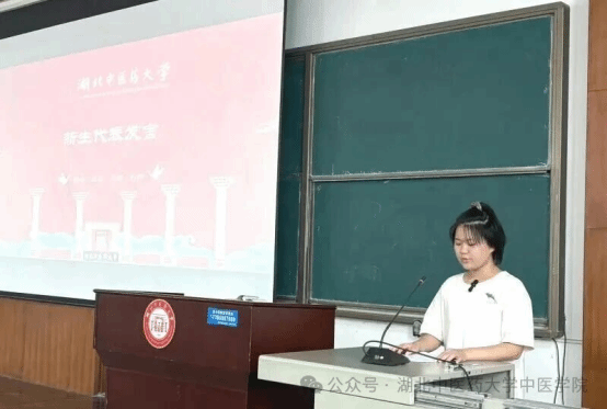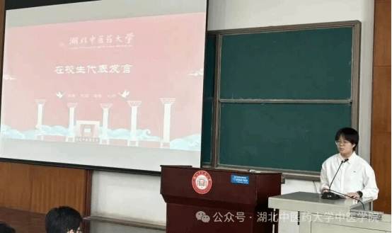 在校生代表、2021级李璇同学围绕“信念”“勤学”“担当”三个关键词,分享了她在湖中医的成长历程,鼓励新生既要夯实专业基础,也要勇于社会践行,做有理想、有本领、有担当的中医新人。